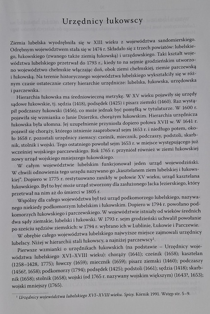 Tom IV liczy 438 stron i poprzedzony jest wstępem – wykazem urzędników łukowskich. W ziemi łukowskiej występuje ten sam problem z urzędnikami, jak i na terenie całej Rzeczypospolitej. Wspominał o tym Adam Boniecki pisząc, „Zdarzało się często, że nie tylko nominacje były wydawane na urzędy tytularne, np. stolników, łowczych lub cześników, naraz kilku osobom, ale nadto, stolnikiewiczów lub łowczynów (czyli dzieci stolnika lub łowczego), zwano w aktach stolnikami, łowczymi, z czego wynikło, że na jednym i tym samym urzędzie spotykamy jednocześnie parę lub kilka osób”. Często np. byłych starostów, zwano w aktach starostami, gdy jednocześnie w tym czasie, na tym stanowisku urzędowała już inna osoba. Dlatego też Czytelnik odnajdzie czasami po kilka osób, występujących na tym samym stanowisku jednocześnie. Nie jest to błąd autora, ale tak wynika z zapisów w aktach parafialnych, i innych materiałów z których korzystałem opracowując spis urzędników łukowskich. Często dany urzędnik występuje w jednej wzmiance pod konkretną datą. Nie mamy informacji, czy był on na tej funkcji przed i po tej dacie. Pojawiają się też zapisy, że w danym roku zmarła osoba pełniąca jakiś urząd. Brak informacji, czy taki zapis był formą grzecznościową wobec zmarłego i jego rodziny, czy też pełnił on ten urząd do śmierci. Wiele osób pełniło jednocześnie kilka funkcji urzędniczych. Nie mogli być jednocześnie w wielu miejscach. Ktoś musiał ich w danej chwili zastępować. Osoby te, mogły w aktach pojawiać się jako te, które pełnią ten urząd. Jednak wobec braku dostatecznych informacji, zmuszony byłem umieścić w wykazie wszystkie informacje na jakie natrafiłem. Zdaję sobie sprawę, że prezentowany wykaz urzędników łukowskich nie jest pełny i zawiera błędy. Po prostu zamieszczam materiał jaki do tej pory udało się zgromadzić. W pracy nad tomem VI Herbarza, trafiam na urzędników nie wymienionych w tomie IV.